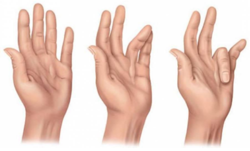 Контрактура Дюпюитрена (французская болезнь, ладонный фиброматоз) – рубцовые деформации и укорочение сухожилий в области кисти, приводящие к сгибанию и фиксации пальцев в неестественном положении и невозможностью их полного разгибания. Наиболее подвержены патологии мизинец и безымянный палец на одной или обеих руках. Симптомы схожи с болезнью Нотта (стенозирующий лигаментит, или синдром щелкающего пальца), однако различить две патологии не составит труда при визуальном осмотре врача.